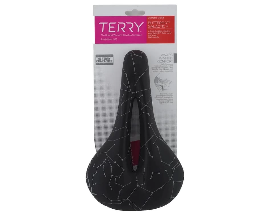 Terry Butterfly Galactic+ Women’s Saddle is designed to take comfort up a notch–and give you a ride that’s out of this world. The limited edition Butterfly Galactic+ has a reflective ink constellation screen-printed cover and the widest cutaway Terry had ever engineered into a Butterfly.